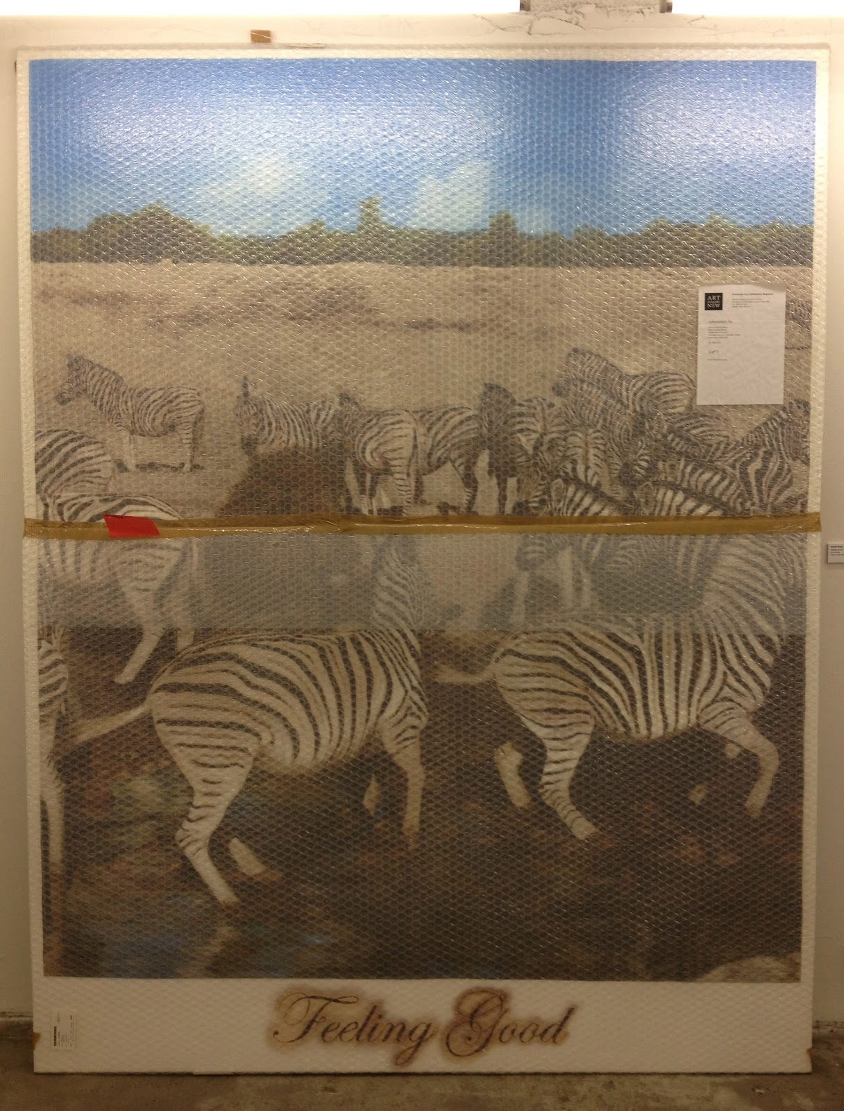 First up was MOP. I really liked Tully Moore's canvas pennants (at least I would call them pennants, they aren't framed and are stretched like on an Obeid smart pole!). These were all oil on canvas but to the naked eye looked like a mainly custom fabric although I gather that was the aim (above left '$$Bills' and right 'Chevron' all 180 x 107cm and $3.4k). Indeed the website says this body of work "looks at how such material links to how we perceive ourselves through branding or patterning, whether that be through a form of camouflage or to use to design to create motif's that link oneself to a particular movement or status". I think Tully has me nailed as a white rasta because I do love red, gold and green together (as Boy George says 'loving would be easy if your colours were like my dream'). MOP usually has some more experimental work and Deb Mansfield does the honours today. This collection of work incorporates 'photographic-tapestry' that is upholstered onto a reproduction Louis settee and is meant to symbolise how armchair travellers like remote places. I have deliberately not included a photo as I want you to imagine what that might look like and then go to MOPs web page to check it out.